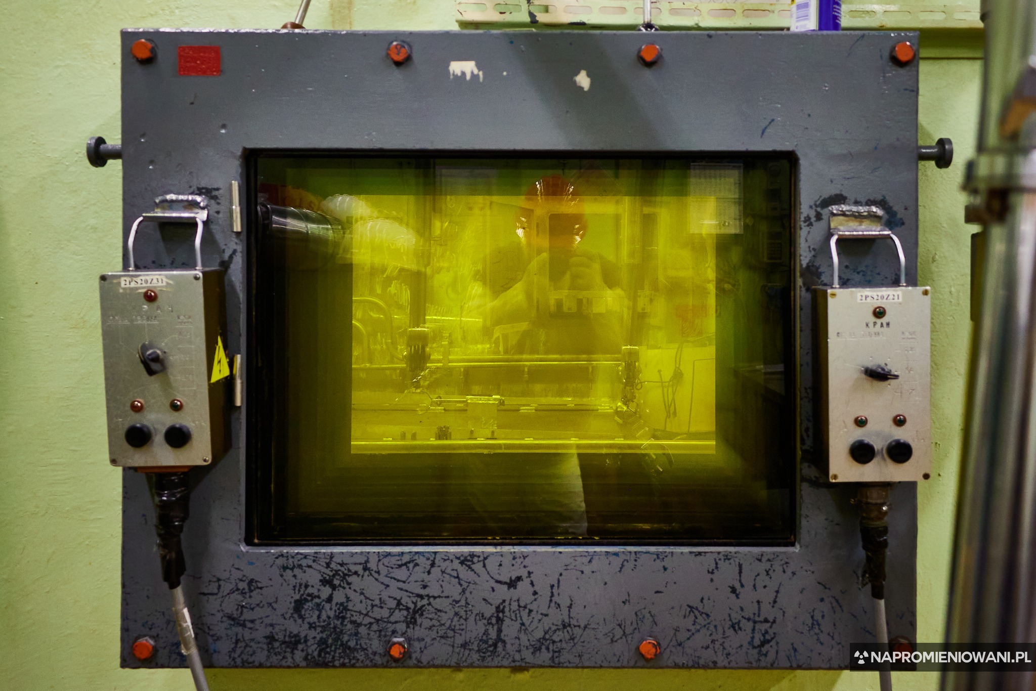 Żółte szkło, które widzicie na pierwszym zdjęciu ma grubość między 60 a 100 cm (wg różnych źródeł) i oddziela strefę roboczą od tzw. gorącej komory. To tam trafiają schłodzone pręty paliwowe, które następnie cięte są na dwie części.