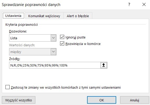 Problem w tym ze ja bym potrzebowal cos pomiedzy na przyklad 75 a 90. W drugim arkuszu mam cos takiego jak picrel. I dlatego jak wpisze z lapy cos innego to wywala blad? Obojetnie czy zedytuje te wartosci w arkuszu 2, czy dopisze swoje lista rozwijalna w pierwszym arkuszu ani dgrnie. Caly czas te same wartosci tam sa :/