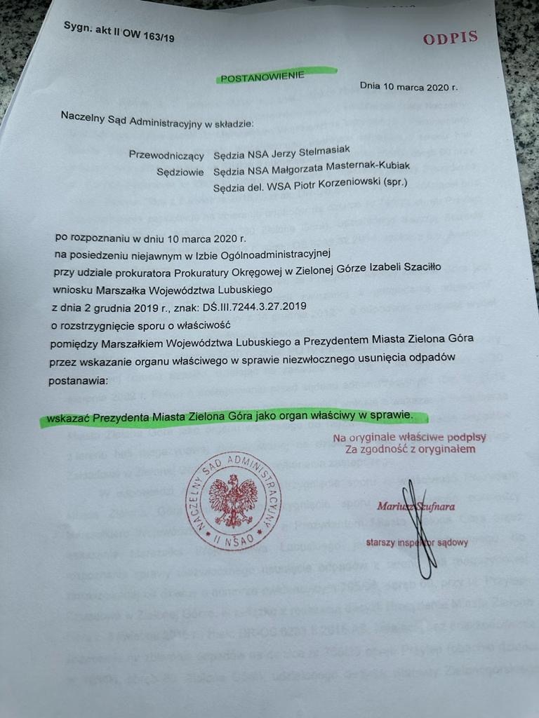 2020 - NSA wydaje postanowienie, że za likwidację składowiska „ch*jwieczego” odpowiada kompetencyjnie Prezydent Miasta Zielona Góra