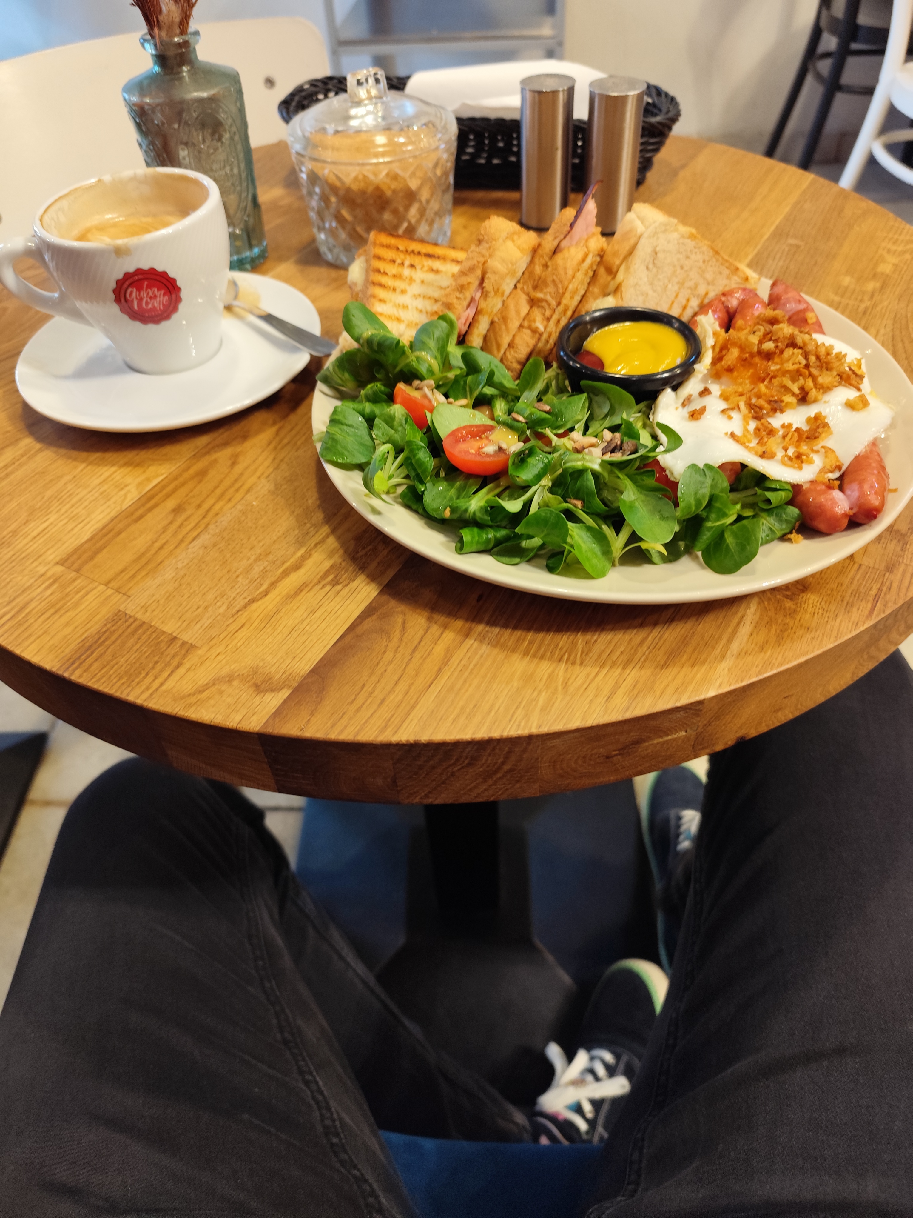 Teraz szamie śniadanie dla Niego w Caffe przy ulicy, o 9:00 oddaje auto do mechanika, później odebrać psa i wrócić #zbiorkom na wschodnie obrzeża miasta.