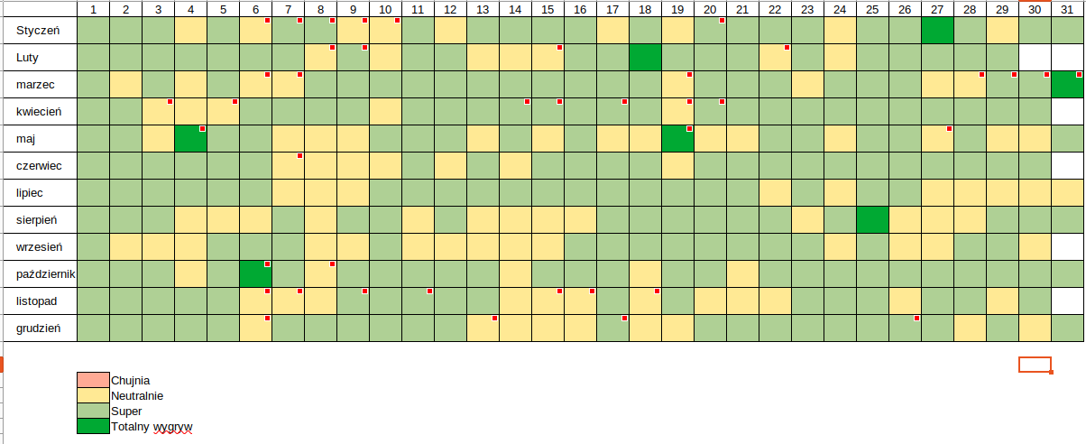 W 2024 nie było ANI JEDNEGO dnia, który oznaczyłem jako c-----y, nawet jeżeli zdarzały się jakieś losowe wydarzenia negatywne to nie wpływały one tak mocno na moje samopoczucie, jak coś robiłem źle to skłaniało mnie to co najwyżej do refleksji nad tym czemu, dlaczego i jak powinienem na to reagować w przyszłości.