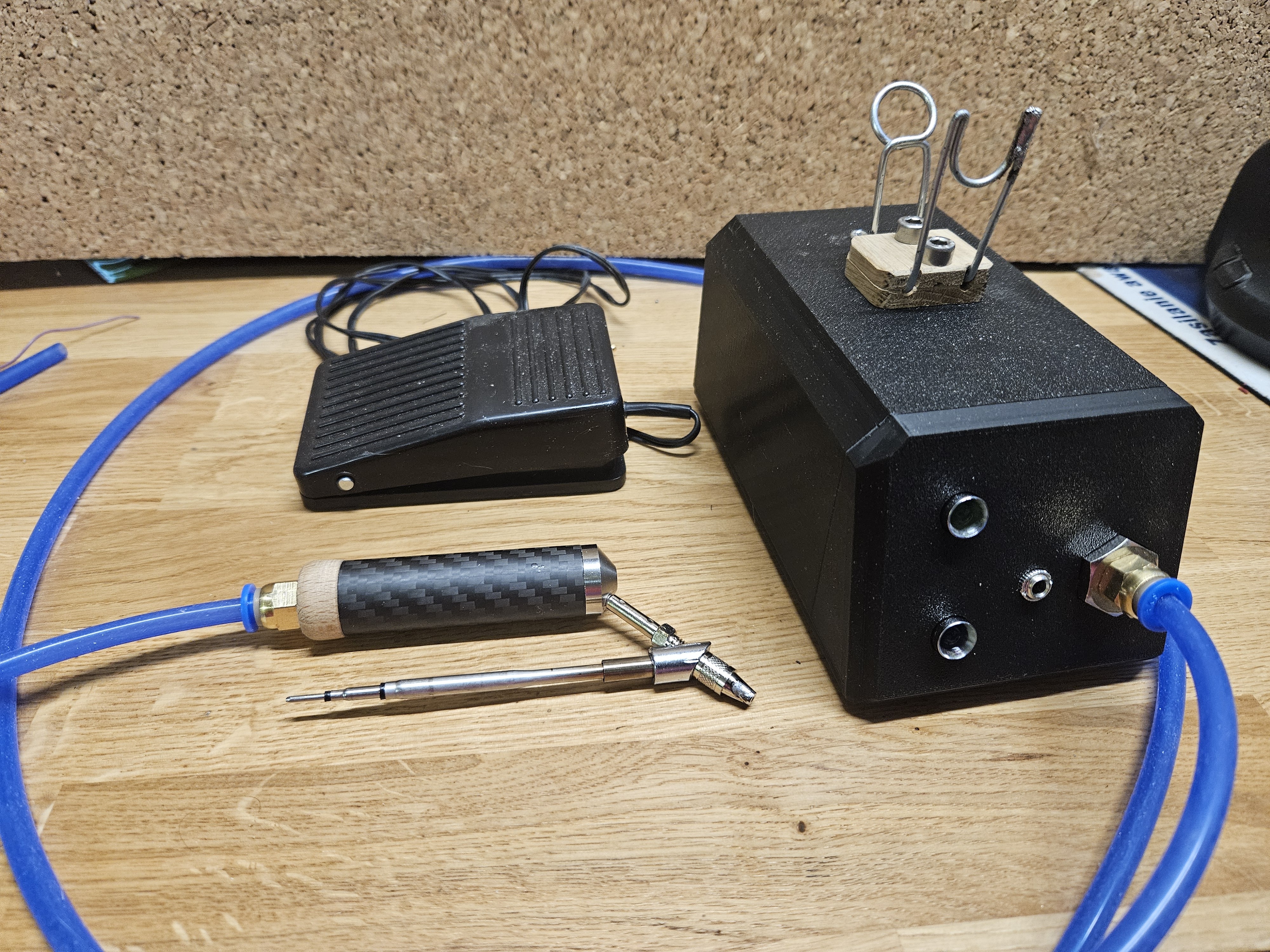 Sama rozlutownica jest po prostu grotem do JBC, widoczne na zdjęciu urządzenie zawiera pompkę (od mercedesa! :) ), filtr i nic istotnego więcej. Pompka jest uruchamiana pedau.... no tym, takim nożnym. Myślałem co prawda o dorobieniu spustu w rączce, ale bardzo nie chciałem tego robić tak, jak to jest wykonane w chińskim pierwowzorze z rączką T12, żadnych dodatkowych idiotycznych kabelków (już dwa w-------ą, trzy w-------y by bardziej), więc myślałem albo o radiowym przycisku albo o sterowaniu pneumatycznym. NIemniej tak jak jest - jest bardzo fajne, włączanie zasysu stopą jest bardzo wygodne i tak zostawię.