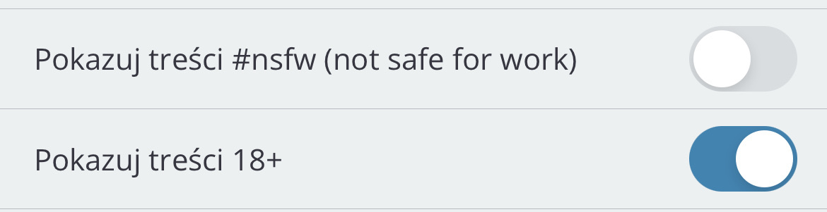 Zaznaczając opcję wyłączona przy pozycji „pokazuj NFSW” z jednoczesną opcją włączoną przy „pokazuj 18+” wpisy nadal się wyświetlają w całości. Dotyczy to wpisów 18+, które mają tag NSFW. To jest chore, że przeglądając mikro publicznie trzeba się zastanawiać, czy zaraz połowa autobusu zobaczy c---i na moim ekranie.