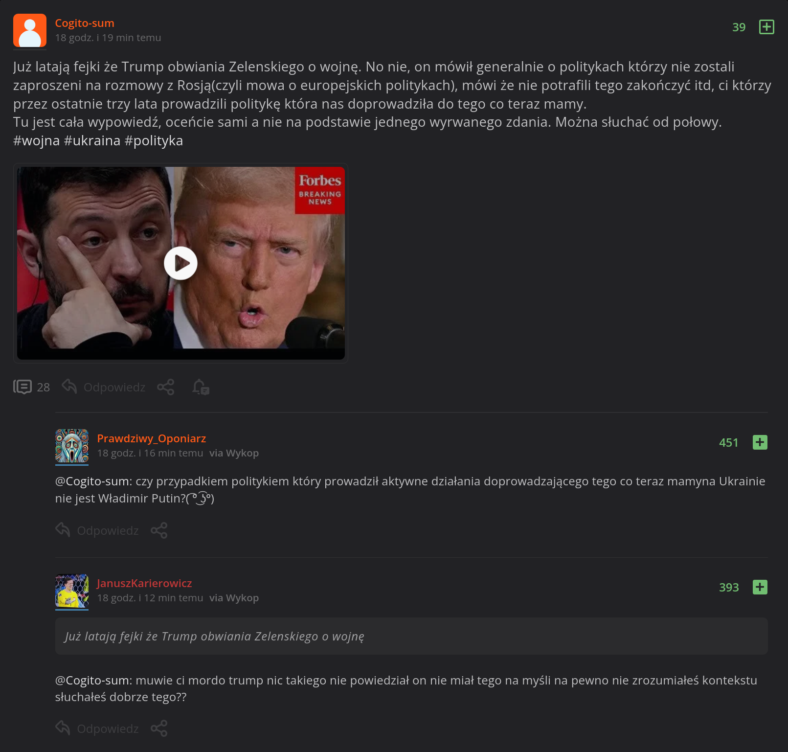 masz_fajne_donice masz_fajne_donice 19.02.2025, 23:56:10 8 + Konfiarze zadowoleni? Jak były wybory to chwaliliście jak dojedzie Rosję, dobry dla Polski itd itp.A teraz te wszystkie konta co spamowały jaki to #trump dobry a demokraci beznadziejni milczą. #bekazkonfederacji #konfederacja
