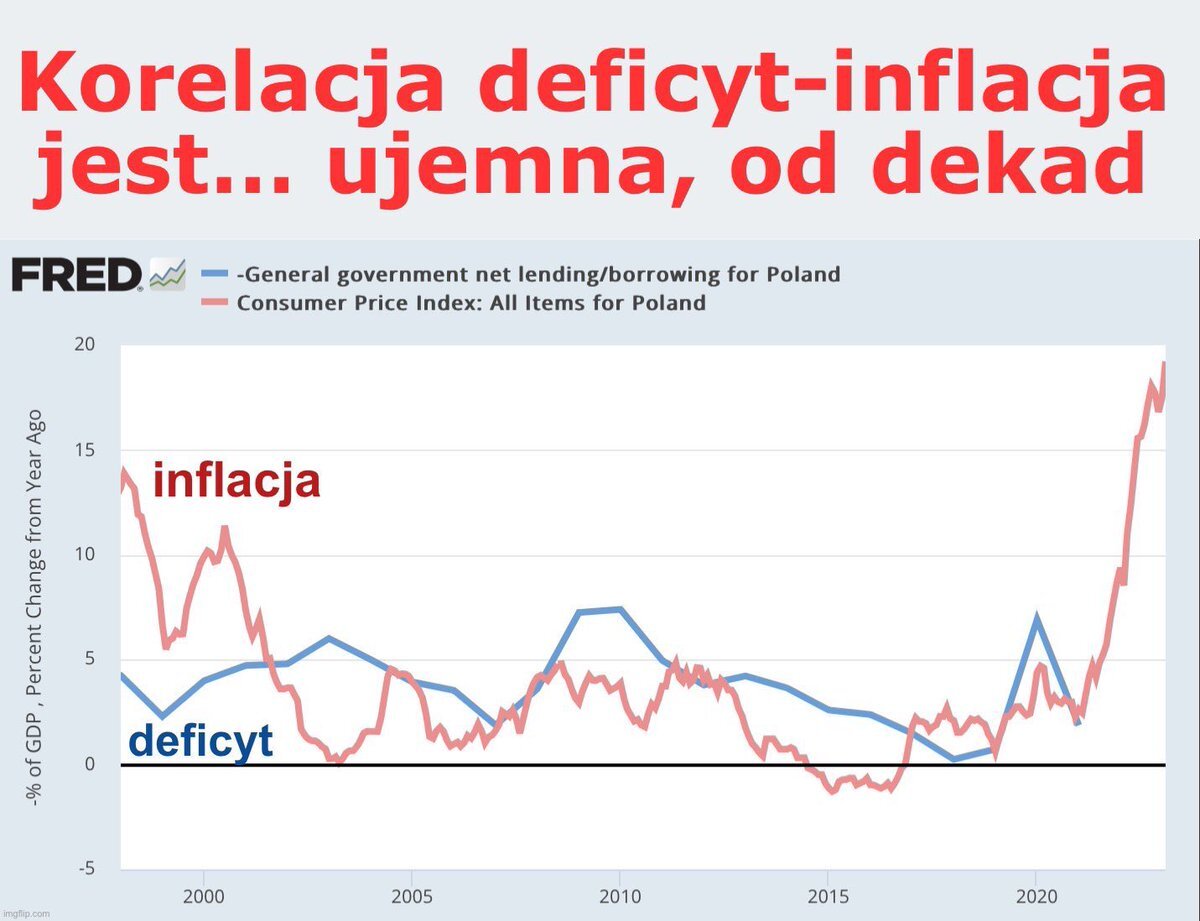 @gorzki99: Bo powstrzymuje je inflacja. Ale w racjonalnych ilościach drukowane pieniądze nie powodują inflacji co pokazuje ten wykres. Korelacja deficyt budżetowy od lat jest ujemna.