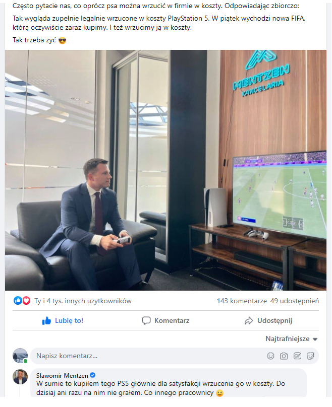 @BalonowySutener Ogólnie zgadzam się z komentarzem, ale czepianie się wrzucenia ps5 w koszty jest prawie tak głupie jak to że on się tym chwali. Firma jak najbardziej może to zrobić, większość to robi i taki jest tego zamysł. To jest taka sama sytuacja jak wliczenie w koszty zakupu krzeseł do pokoju socjalnego lub kawy dla pracowników.
