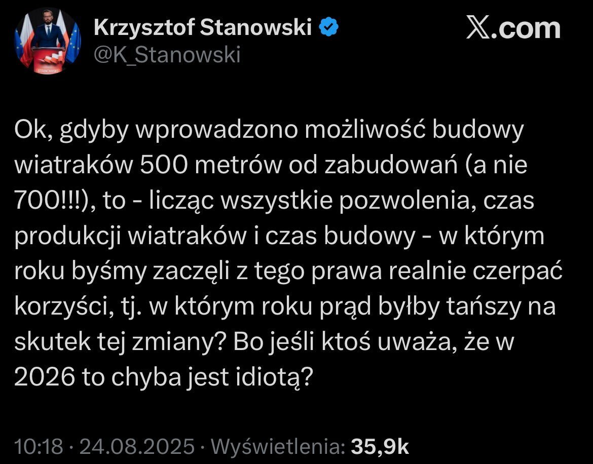 Poza tym. Skoro te 200 metrów to taka zagłada rynku wiatrowego - to ile GW mocy na tych 200 metrach nie zostanie zainstalowane do 2030 roku?
