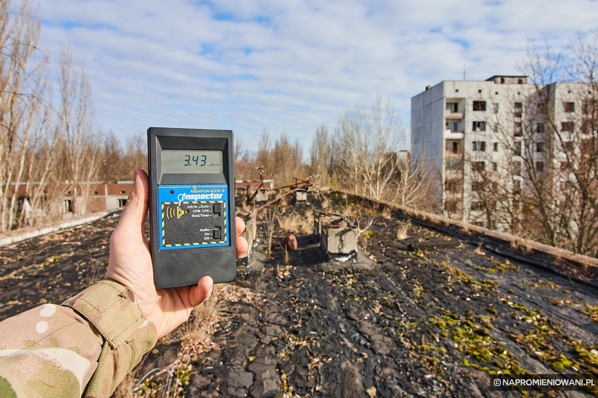 Choć teren wokół bloku był stosunkowo czysty (około 0,5 μSv/h), to na jego dachu wartości skoczyły do 3 μSv/h. Fakt, dachy często są bardziej radioaktywne przez zbierającą się tam wodę, ale nie aż tak. No i zwykle poziom radiacji podwyższony jest tylko w pojedynczych miejscach, a nie na całej powierzchni. W tym przypadku punktowo dało się zarejestrować nawet 23 μSv/h. Skąd więc ta różnica?