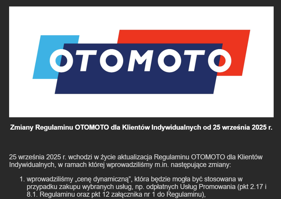właśnie dostałem mail ze otomoto wprowadza od 25 września "cene dynamiczna" - cena, której wysokość jest zmienna, w odpowiedzi na popyt rynkowy. Aktualna wysokość ceny dynamicznej jest dostępna podczas uzupełniania formularza Ogłoszenia lub przed zakupem danej usługi odpłatnej.