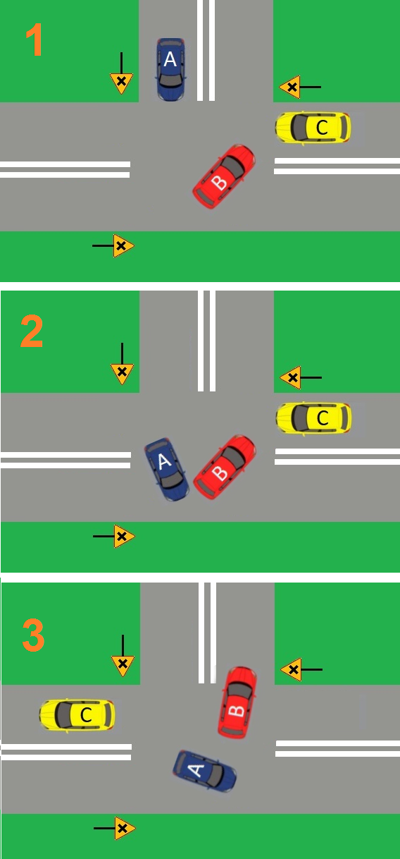 B dojeżdża do osi, zatrzymuje się i czeka aż przejedzie C