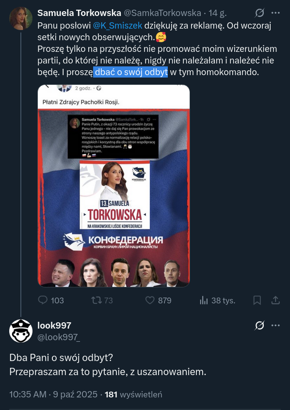 źródło: Screenshot 2025-10-09 at 22-15-25 look997 w serwisie X „@SamkaTorkowska @K_Smiszek Dba Pani o swój odbyt Przepraszam za to pytanie z uszanowaniem.” _ X