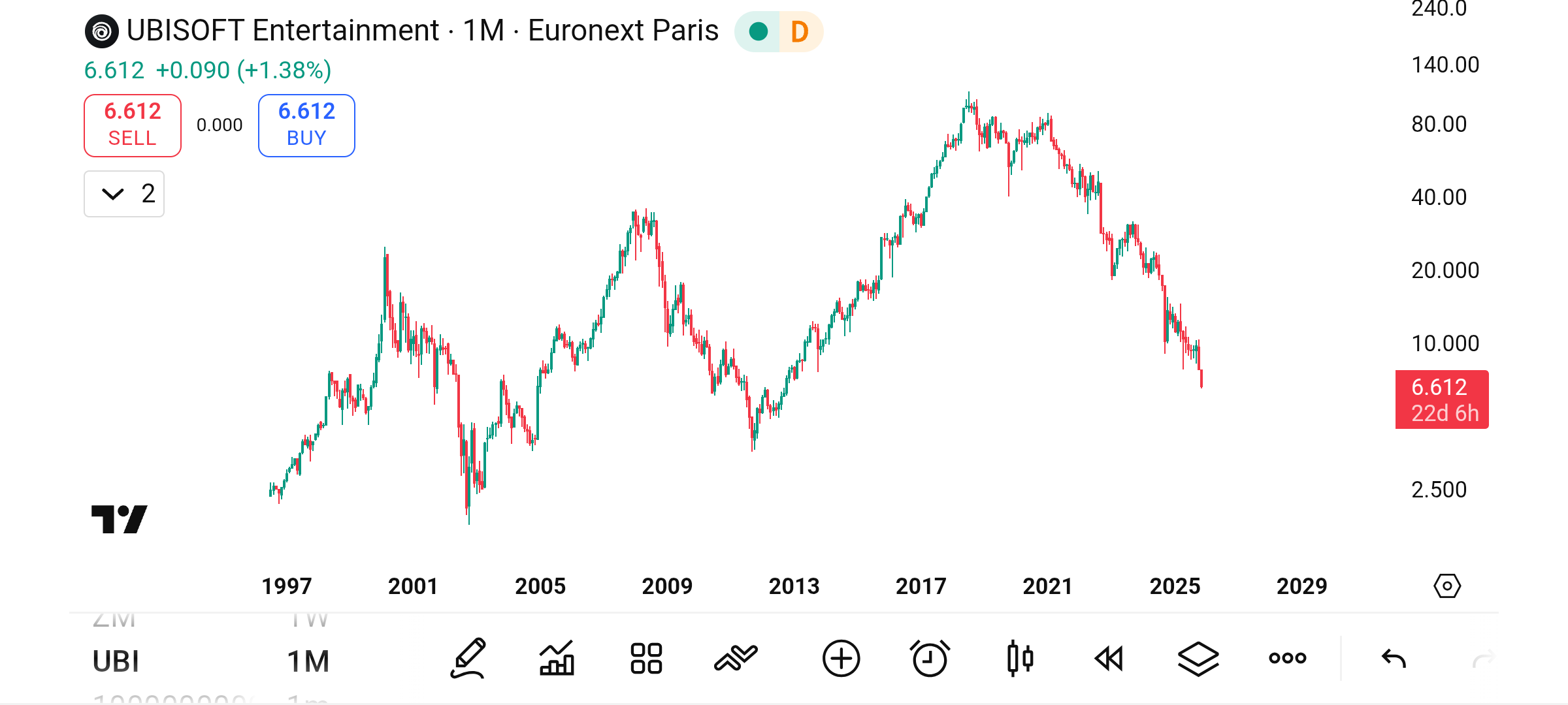 Leciało w dół jak głupie, w pierwsze dni listopada. Kupiłem, i jestem 10% na minusie :p Dziś, i wczoraj, sytuacja się lekko ustabilizowała, cena krąży wokół 6,60€. Za 7 dni ogłaszają wyniki finansowe. #ubisoft #gielda