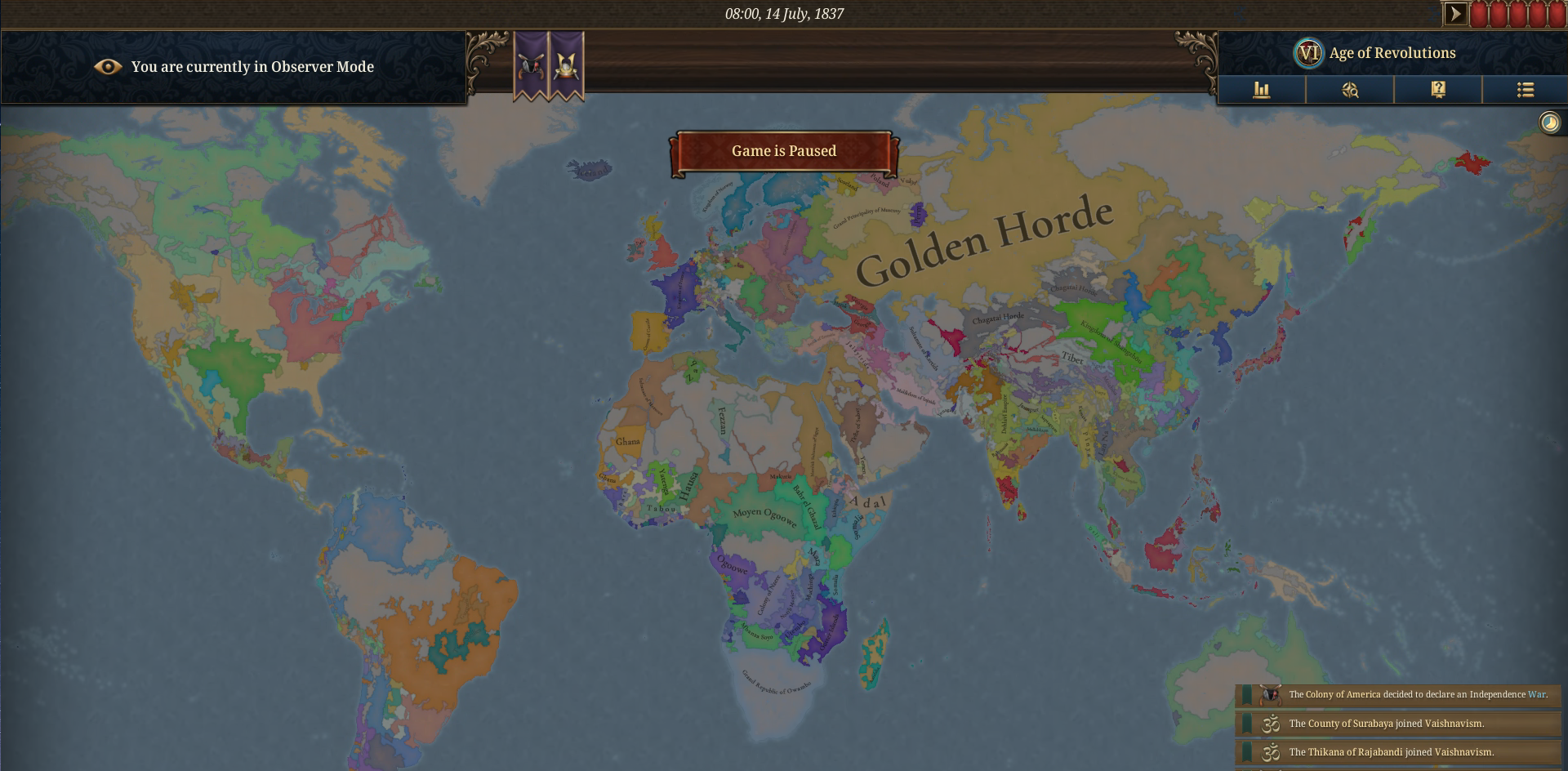 Obecnie gra jest na 1720 r. Pewnie doprowadzę tę symulację do końca. Macie jakieś pytania? Chcecie zobaczyć jakąś część mapy?