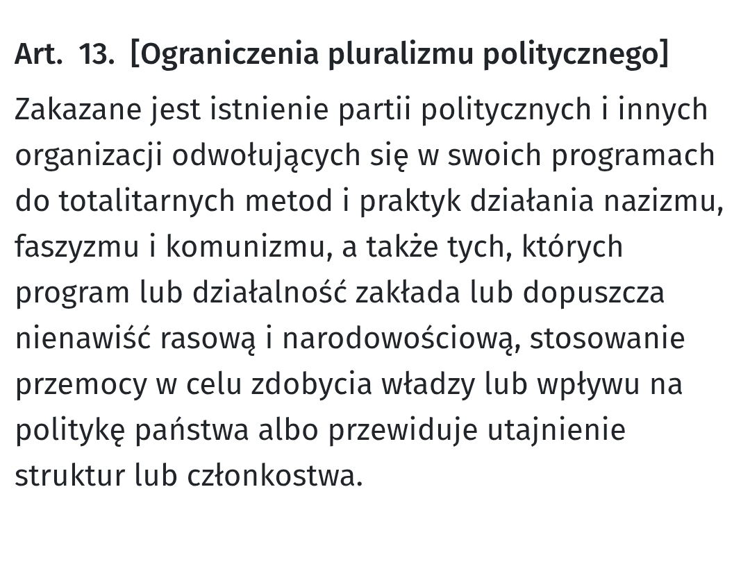 Art. 13 Konstytucji RP jest jasny: Zakazuje istnienia partii, których program lub metody działania zakładają nienawiść narodowościową lub stosowanie przemocy w celu zdobycia władzy.