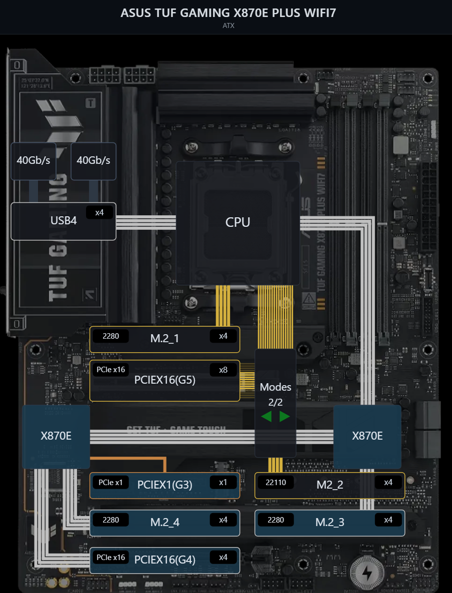 Najbardziej rozbudowana płyta, która zadowoli każdego i nie zapłacicie zbyt dużo za nią. Podłączyłem do niej 2 dyski M.2 GEN.5 (4 + 4 TB), dwa dyski SSD (8 + 8 TB) i 2 dyski twarde (10 TB + 24 TB). I jeszcze mogę podłączyć aż dwa dyski M.2. Jeszcze nigdy się nie zawiodłem na produktach Asusa. Wszystko się zmieściło do obudowy be quiet! Shadow Base 800 FX Black.